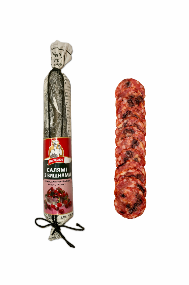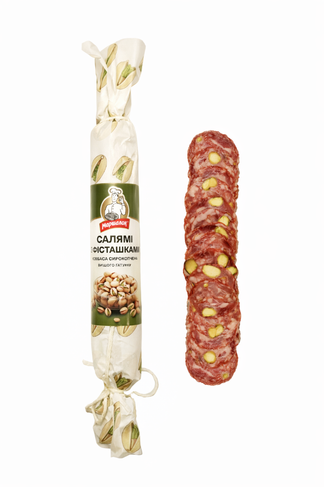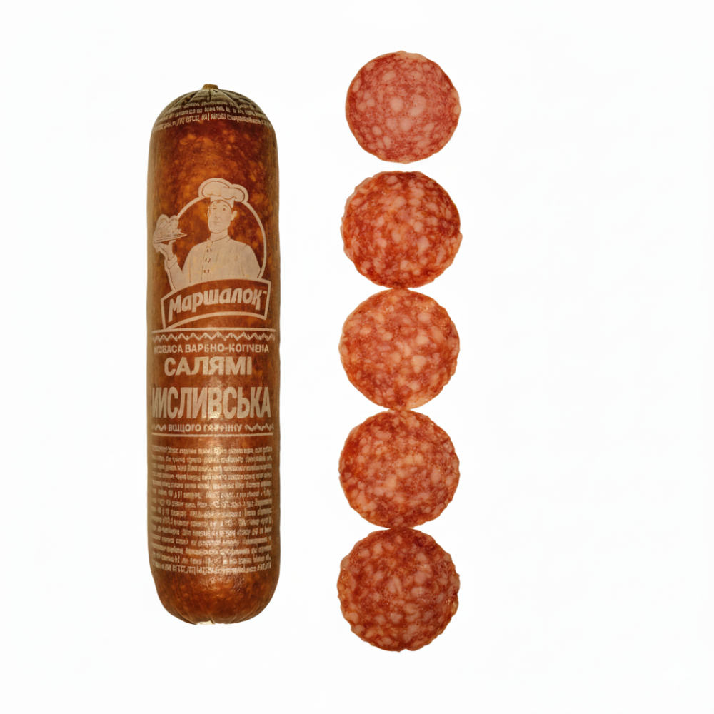 Склад: яловичина першого ґатунку, сало ковбасне хребтове, свинина нежирна, філе куряче, сіль кухонна, харчова добавка (сіль кухонна, ароматизатор салямі (включаючи аромат диму), підсилювач смаку та аромату: глутамат мононатрію, гуанілат натрію, інозинат динатрію, цукор, прянощі, цибуля-порей, колір: екстракт паприки), стартова культура (сахароза, Lactobacillus sakei, Staphylococcus carnosus, Pediococcus acidilactici, сульфат марганцю), консервант та фіксатор кольору нітрит натрію.Може містити залишки гірчиці. Енергетична цінність 100 г продукту: 2667,6 kJ(кДж)/645,7 kcal(ккал)Поживна (харчова) цінність 100 г продукту: жири – 61,3 g(г), з них насичені – 26,2 g(г); вуглеводи – 0,2 g(г), з них цукри – 0,07 g(г); білки – 23,3 g(г); сіль – 5,0 g(г)Умови та строки зберігання: у герметичному пакованні за температури 0+6°С і відносної вологості повітря 75% - 78% - 45 дібВид паковання: вакуумне паковання