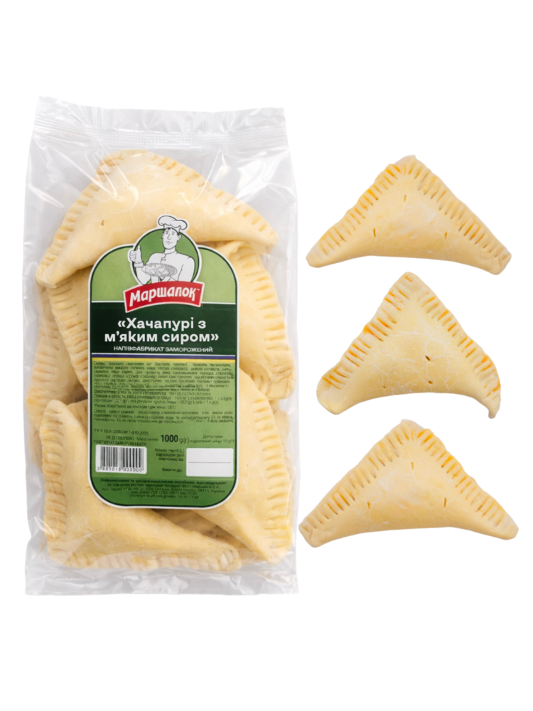 Склад: сир м’який (50%), борошно пшеничне в/г, вода питна, маргарин для тіста листкового з масовою часткою жиру 80% (жири рослинні у стверділому стані; вода питна підготовлена; олія соняшникова; сіль харчова; ароматизатор «Масло-вершки»; емульгатори дистильований моногліцерид, соєвий лецитин; консервант сорбінова кислота; барвник натуральний β-каротин; регулятор кислотності лимонна кислота), яйця курячі, сіль кухонна, часник, зелень кропу. Енергетична цінність 100 г продукту: 1127,6kJ(кДж)/269,2kcal(ккал)Поживна (харчова) цінність 100 г продукту: жири –13,2g(г); з них насичені –7,0g(г); вуглеводи-24,1g(г), без доданих цукрів; білки –13,5g(г); сіль – 1,1g(г)Умови та строк зберігання: при температурі мінус 18°С - 90 дібСпосіб приготування: заморожені хачапурі розкласти на деках, змащених олією, витримати при кімнатній температурі 20-30 хв, випікати за температури 200°С протягом 20-30 хв Вид паковання: поліпропіленовий пакет