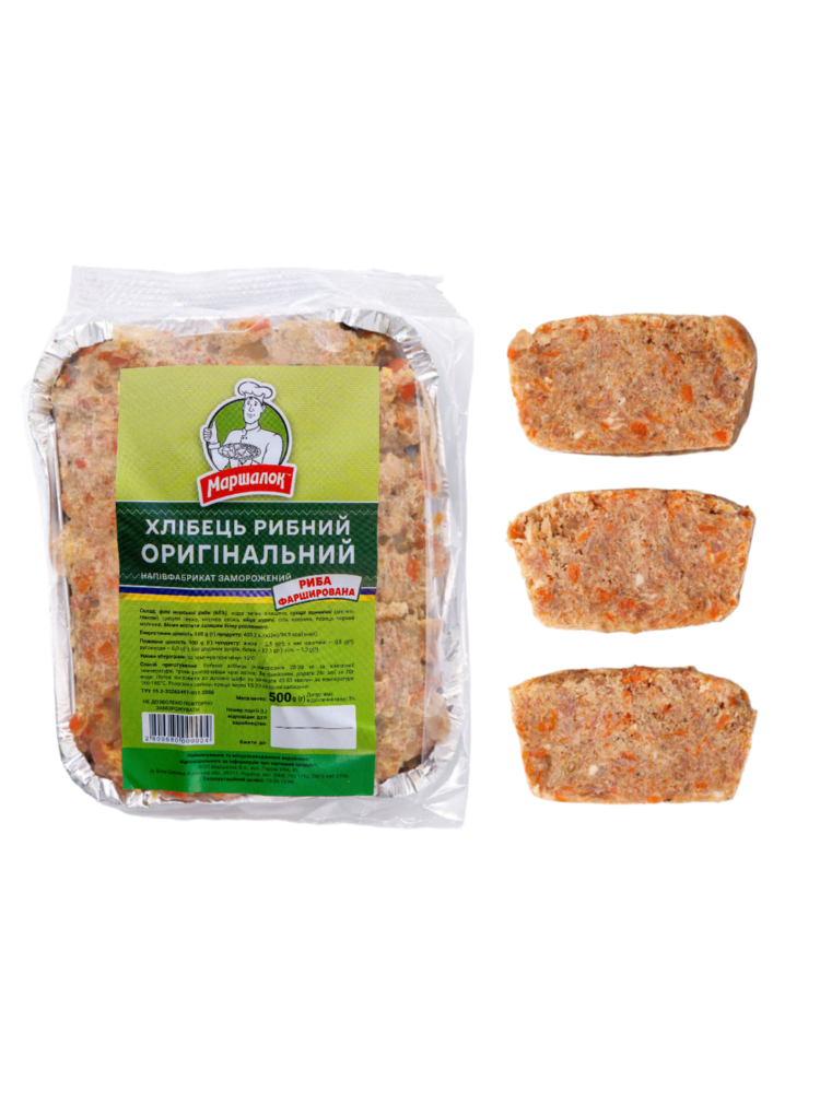 Склад: філе морської риби (65%), вода питна очищена, сухарі пшеничні (містять глютен), цибуля свіжа, морква свіжа, яйця курячі, сіль кухонна, перець чорний мелений. Може містити залишки білку рослинногоЕнергетична цінність 100 г продукту: 400,2 kJ(кДж)/94,9 kcal(ккал)Поживна (харчова) цінність 100 г продукту: жири – 2,5 g(г); з них насичені – 0,5 g(г); вуглеводи - 6,0 g(г), без доданих цукрів; білки – 12,1 g(г); сіль – 1,3 g(г).Умови та строк зберігання: при температурі мінус 18°С - 90 дібСпосіб приготування: рибний хлібець розморозити 20-30 хв за кімнатної температури, трохи розгорнувши краї лотка. За бажанням, додати 20г олії та 20г води. Лоток поставити до духової шафи та запікати 40-50 хвилин за температури 160-180°С. Розрізати хлібець краще через 15-20 хв після запікання.