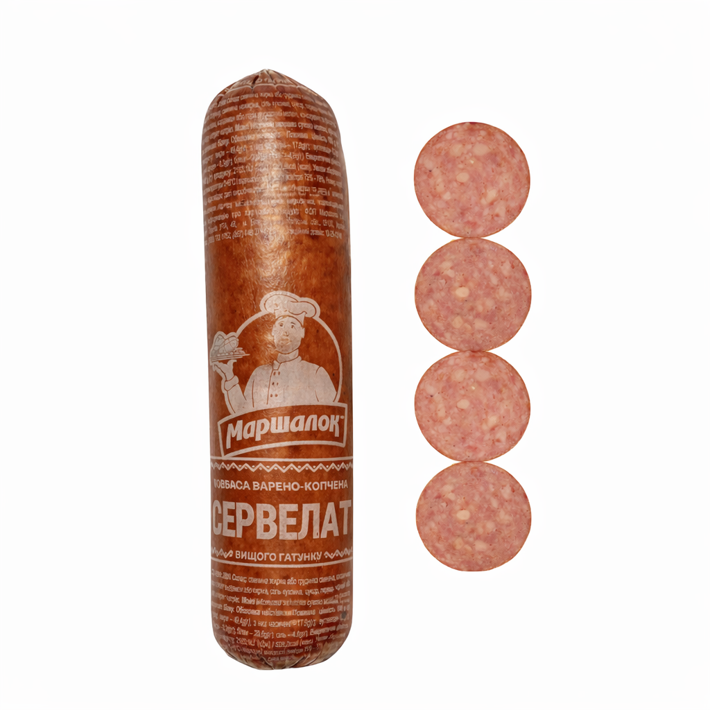 Склад: яловичина вищого ґатунку, свинина нежирна, сіль кухонна, часник, харчова добавка (загущувачі: карагенан, ксантанова камідь; тваринний білок, стабілізатори: пірофосфати, трифосфати, поліфосфати; підсилювачі смаку: глутамат натрію, гуанілат натрію; антиокислювач ізоаскорбат натрію, сіль харчова, екстракт перцю чорного), консервант та фіксатор кольору нітрит натрію. Може містити залишки яєць курячих, сухого молока, рослинного білку, гірчиці. Оболонка неїстівна. Енергетична цінність 100 г продукту: 610,1 kJ(кДж)/146,7 kcal(ккал)Поживна (харчова) цінність 100 г продукту: жири – 10,7 g(г), з них насичені - 4,0 g(г); вуглеводи- 0,2 g(г), без доданих цукрів; білки – 12,5 g(г); сіль - 1,9 g(г)Умови та строк зберігання: за температури 0+6°С і відносної вологості повітря 75% - 78%,за умови цілісності оболонки - 30 дібВид паковання: поліамідна оболонка