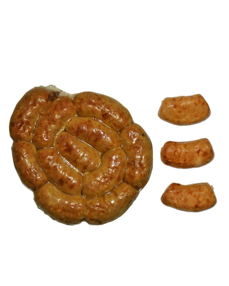 Склад: м'ясо птиці (куряче), сало ковбасне хребтове, сіль кухонна, харчова добавка (декстроза, перець чорний, підсилювач смаку та аромату глутамат натрію, сироп глюкози, антиоксидант аскорбат натрію, екстракти спецій (мускатний горіх, кмин), стартова культура, консервант та фіксатор кольору нітрит натрію. Може містити залишки пшеничної клітковини, гірчиці. Оболонка неїстівнаЕнергетична цінність 100 г продукту: 2281,3 kJ (кДж)/ 551,1 kcal (ккал)Поживна (харчова) цінність 100 г продукту: жири – 48,7 g(г), з них насичені – 21,2 g(г); вуглеводи – менше 0,1 g(г), без доданих цукрів; білки – 28,2 g(г); сіль – 4,5 g(г)Умови та строки зберігання: у герметичному пакованні за температури 0+6°С і відносної вологості повітря 75% - 78% : цілим батоном - 120 діб, порційна нарізка (1/2 батону) - 60 діб, сервірувальна нарізка - 45 дібВид паковання: фіброузна оболонка, вакуумне паковання