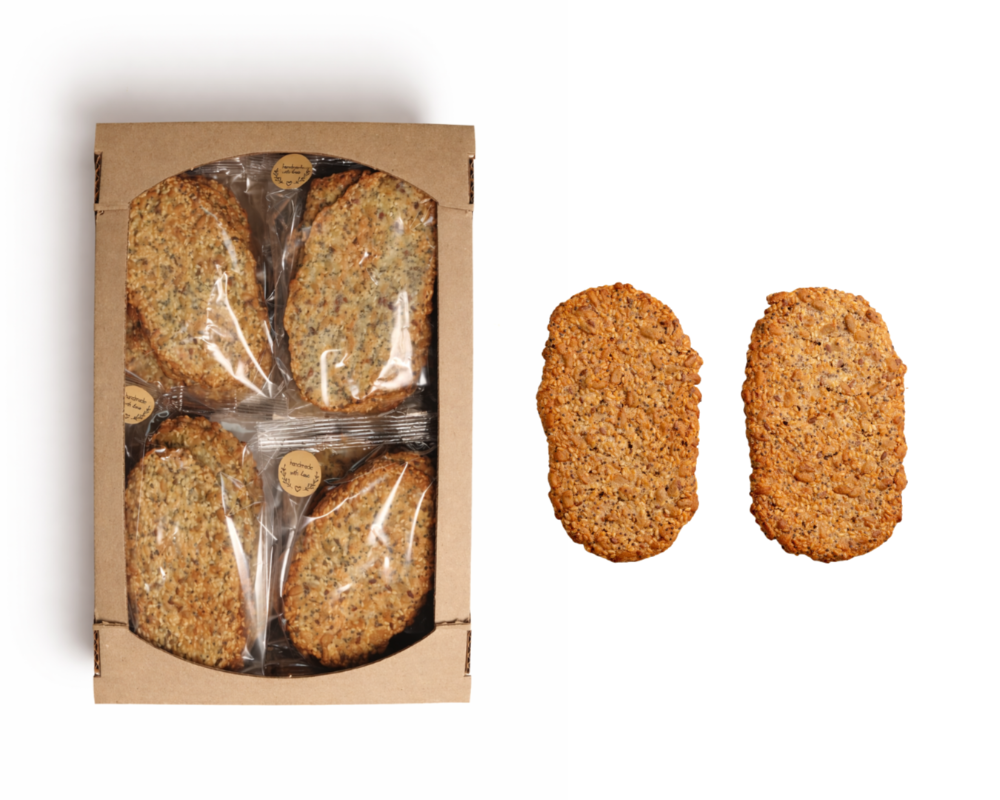 Склад: насіння кунжуту - не менше 35%, цукор, борошно пшеничне в/г (містить глютен), маргарин столовий 82% жиру (містить соєвий лецитин), меланж яєчний рідкий пастеризований, сік лимона, розпушувач (пірофосфати, сода харчова; борошно пшеничне), сіль кухонна, ароматизатор ванілін. Може містити залишки молочних продуктів, арахісу, горіхів. Поживна (харчова) цінність 100 г продукту: жири – 32,4g(г), з них насичені – 5,5 g(г); вуглеводи – 41,4g(г), з них цукри – 24,2g(г); білки – 10,9g(г); сіль – 0,7g(г)Енергетична цінність 100 г продукту: 2124,9kJ(кДж)/ 500,8kcal(ккал)Умови та строк зберігання: при відносній вологості повітря не більше 75 %, за температури 18 (±5)°С - 30 діб