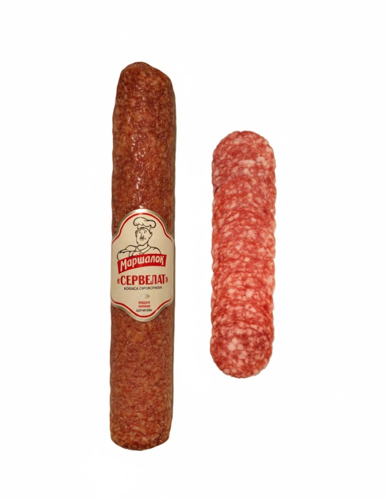 Склад: яловичина вищого ґатунку, сало ковбасне хребтове, сіль кухонна, цукор, перець чорний або білий мелені, кардамон або горіх мускатний мелені, стартова культура (сахароза, Lactobacillus sakei, Staphylococcus carnosus, Pediococcus acidilactici, сульфат марганцю), консервант та фіксатор кольору нітрит натрію. Оболонка неїстівнаЕнергетична цінність 100 г продукту: 2176,6 kJ (кДж)/ 525,7 kcal (ккал)Поживна (харчова) цінність 100 г продукту: жири – 46,1 g(г), з них насичені – 20,5 g(г); вуглеводи – 0,5 g(г), з них цукри – 0,4 g(г); білки – 27,2 g(г); сіль – 6,0 g(г)Умови та строки зберігання: у герметичному пакованні за температури 0+6°С і відносної вологості повітря 75% - 78% : цілим батоном - 120 діб, порційна нарізка (1/2 батону) - 60 діб, сервірувальна нарізка - 45 дібВид паковання: фіброузна оболонка, вакуумне паковання